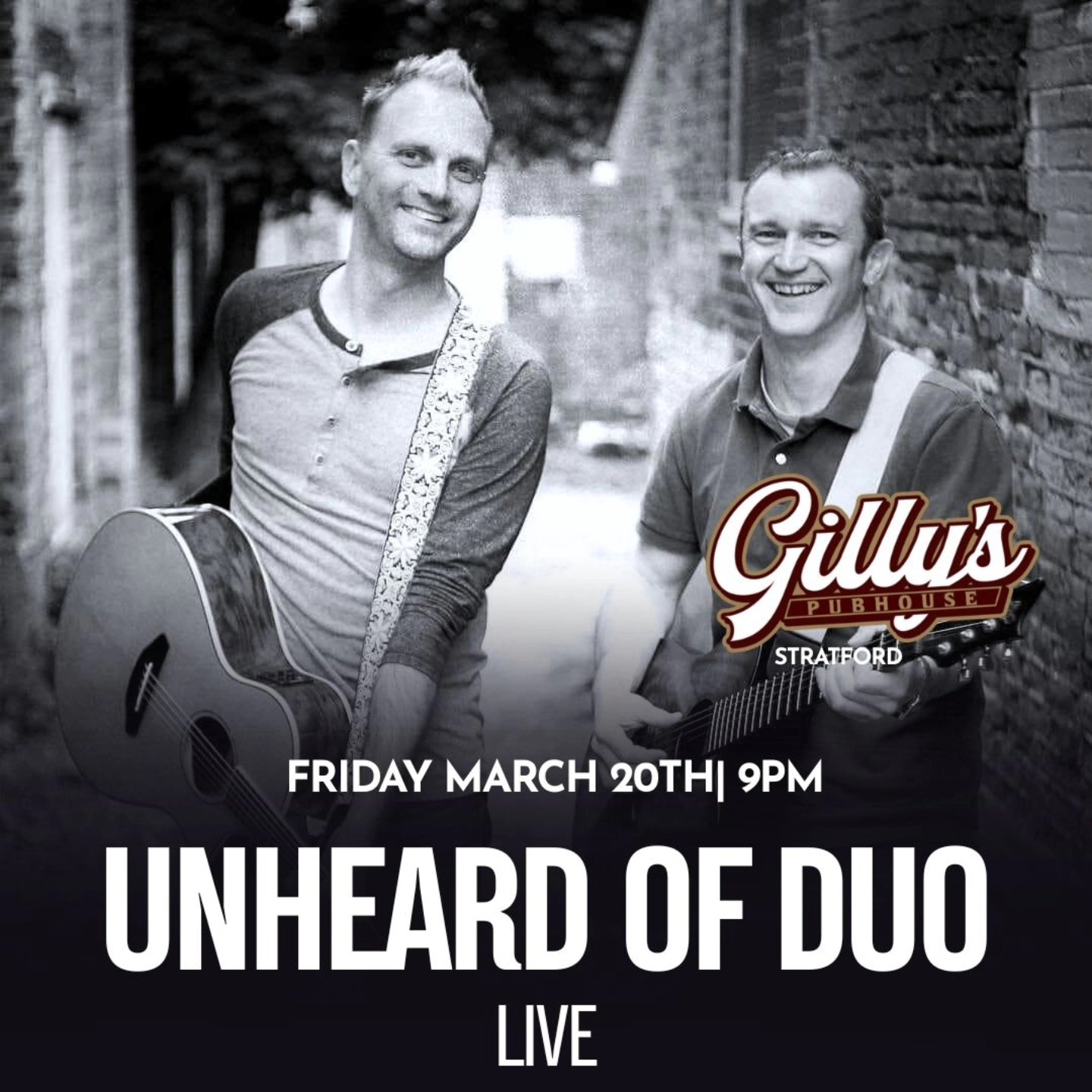 Unheard of Duo Come out and enjoy live music from the Unheard of Duo starting at 9pm. + Add to Google Calendar + iCal / Outlook export Date Mar 20 2026 Time 9:00 pm Location Gilly's Pubhouse 92 Downie Street, Stratford, Ontario Category Music Stratford After Dark Organizer Gilly's Pubhouse Phone 519-271-3939 Email gillyspubhouse@gmail.com Website https://www.facebook.com/GillysPubhouse